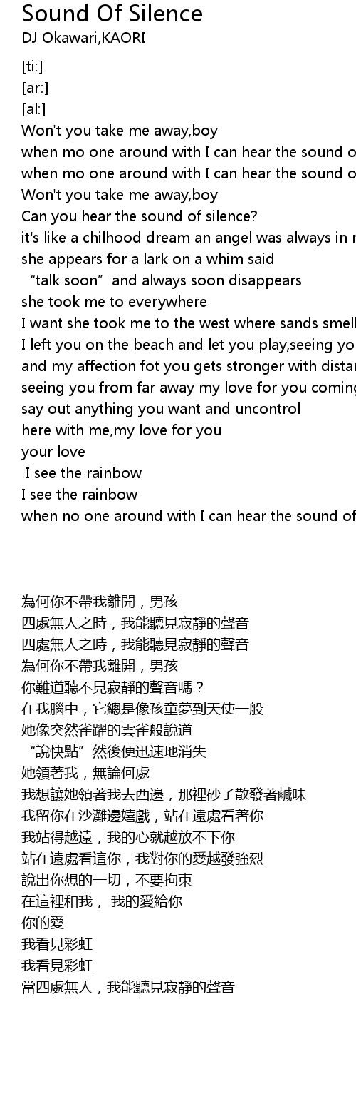 | [00:40.97] | when mo one around with I can hear the sound of silence |