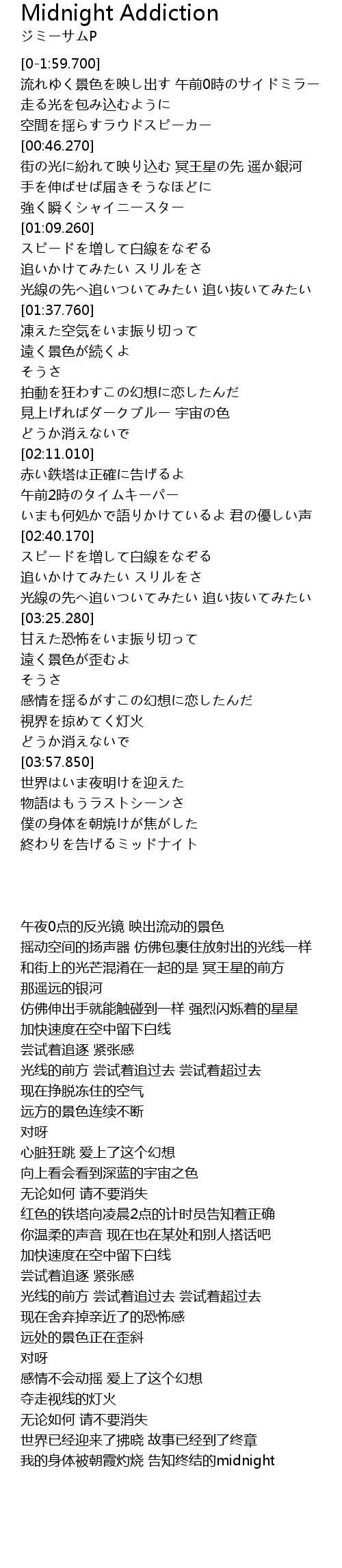 | [04:19.800] | 僕の身体を朝焼けが焦がした 終わりを告げるミッドナイト |