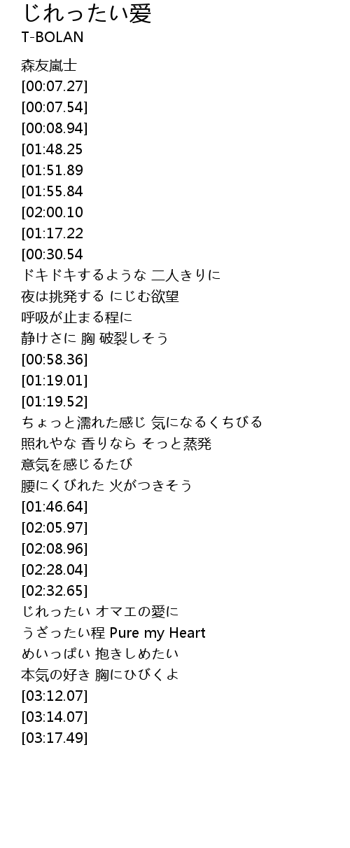 | [02:34.58][01:48.25][00:59.87][00:09.36] | ※じれったい オマエの愛が |