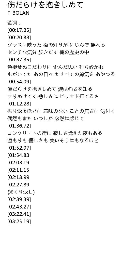 | [03:02.05][02:11.15] | 傷だらけを抱きしめて 優しさは胸に響く |