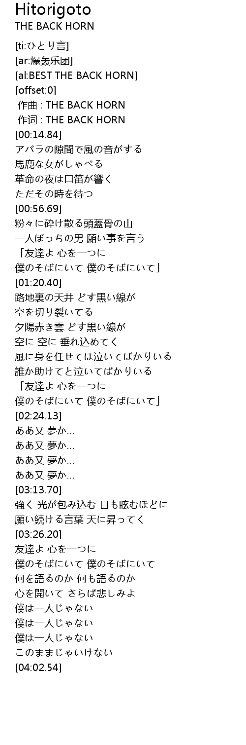 | [00:01.00] | zuò cí : THE BACK HORN |