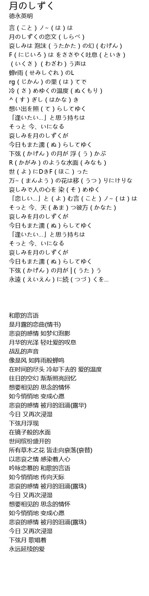 | [03:05.24] | 「恋しい…」と(よ)む言(こと)ノ~(は)は |