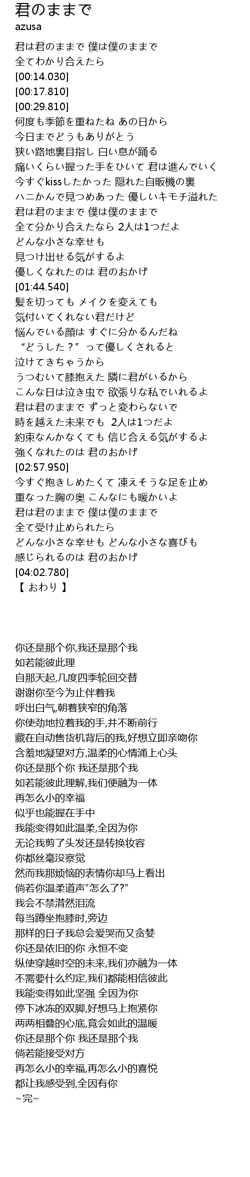 | [02:31.160] | 君は君のままで ずっと変わらないで |