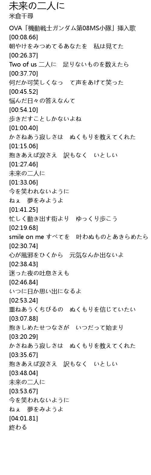 | [01:30.79] | 未来の二人に |