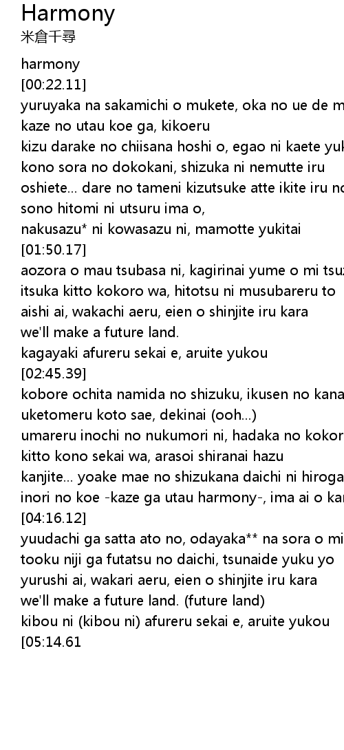| [04:00.39] | inori no koe -kaze ga utau harmony-, ima ai o kanade hajimeru |