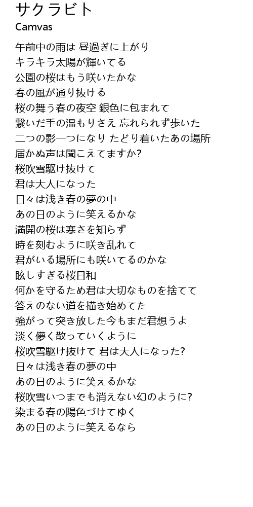 | [03:09.95] | 桜吹雪駆け抜けて 君は大人になった? |