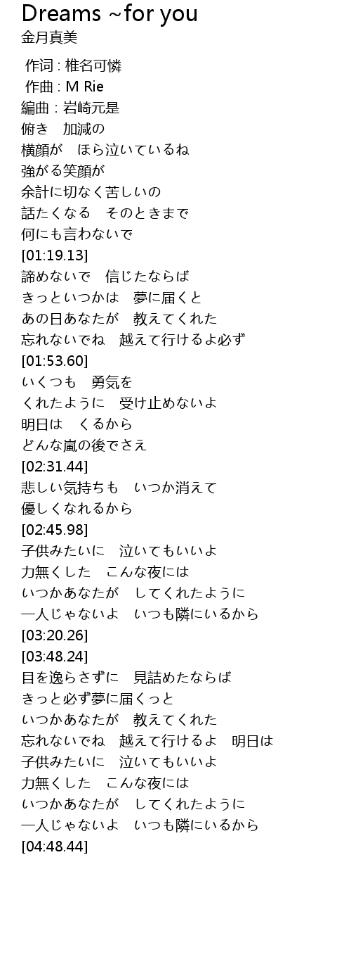 | [04:38.44] | 一人じゃないよ いつも隣にいるから |