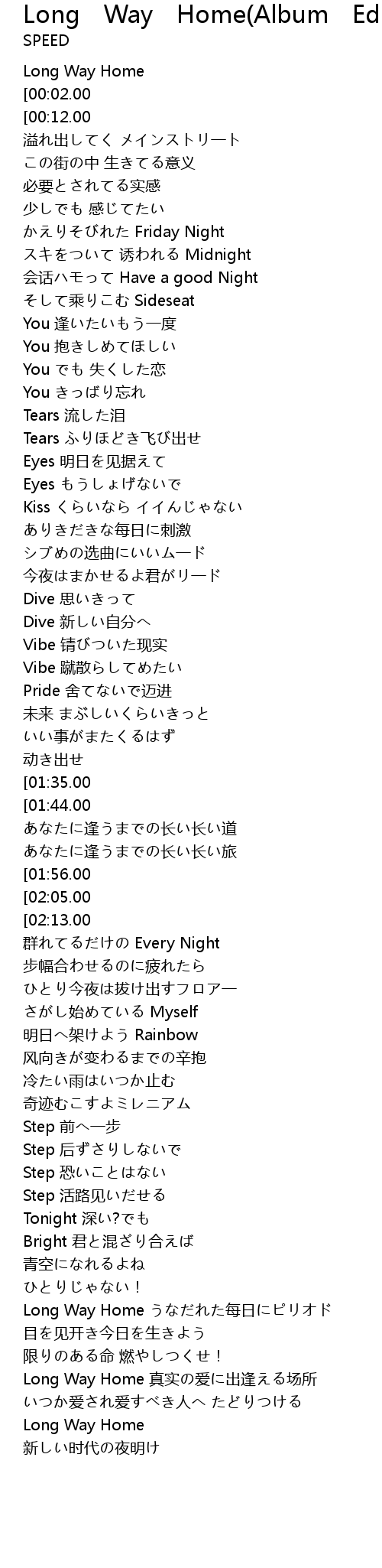 | [04:25.00][01:56.00] | Long Way Home 暖かい爱にかえれる场所 |