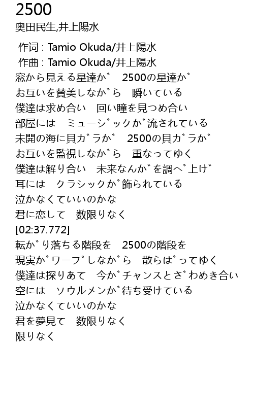 | [00:01.000] | 作曲 : Tamio Okuda/井上陽水 |