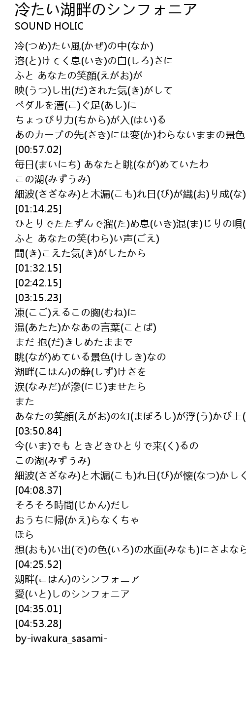 | [04:26.11] | 湖畔(こはん)のシンフォニア 愛(いと)しのシンフォニア |