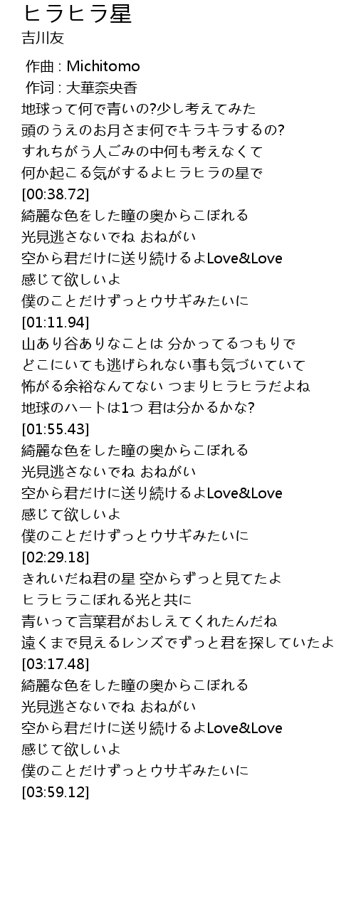 | [00:54.14] | 空から君だけに送り続けるよLove&Love |