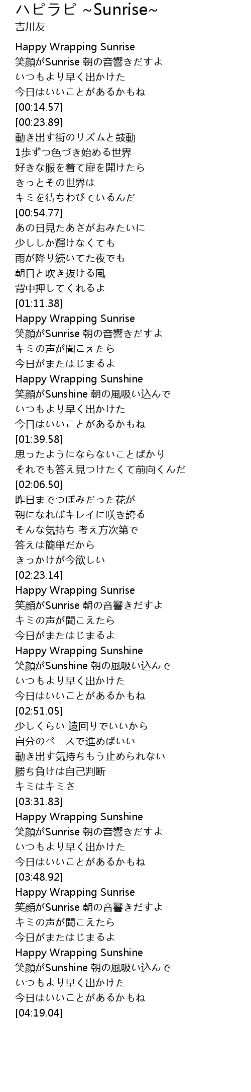 | [00:02.01] | 笑顔がSunrise 朝の音響きだすよ |