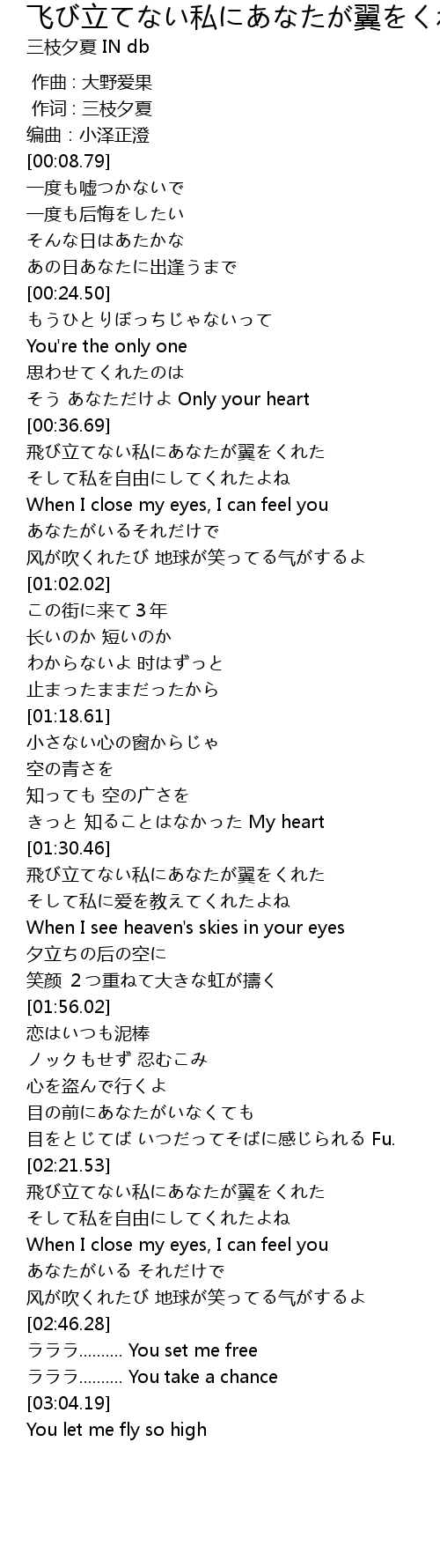 | [02:22.28] | 飛び立てない私にあなたが翼をくれた |