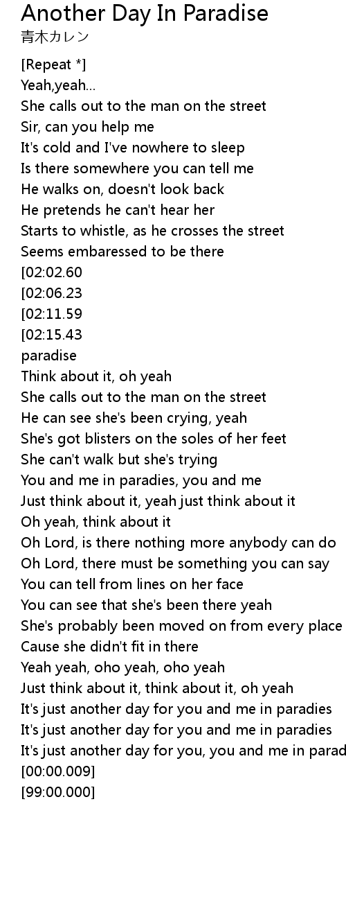 | [03:33.10][02:15.43][01:19.16] | Cause it's another day for you you and me in paradise |