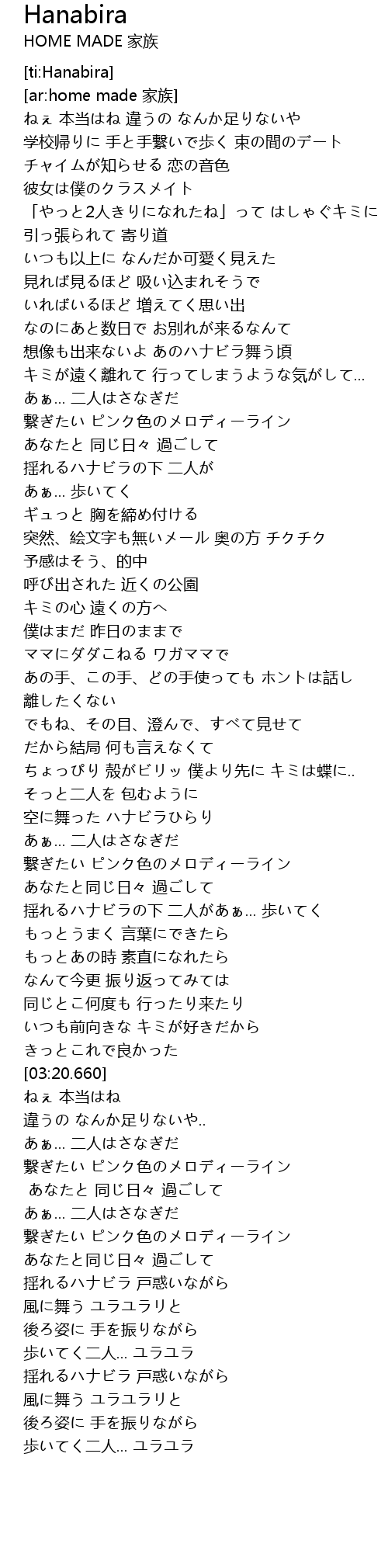 | [02:45.090] | 揺れるハナビラの下 二人があぁ... 歩いてく |