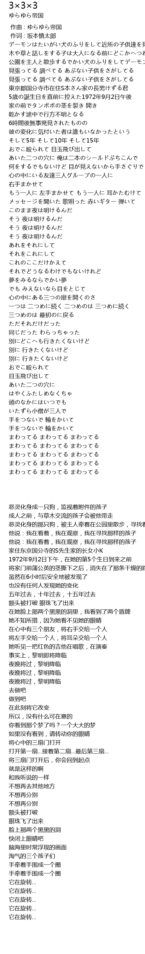 | [03:00.31] | 一つは 二つめに続く 二つめのは 三つめに続く |