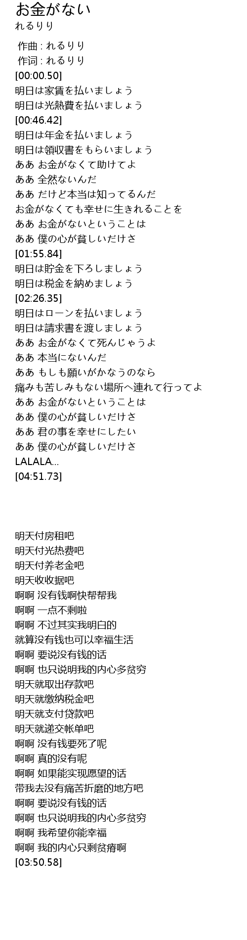| [01:09.46] | ああ お金がなくて助けてよ |