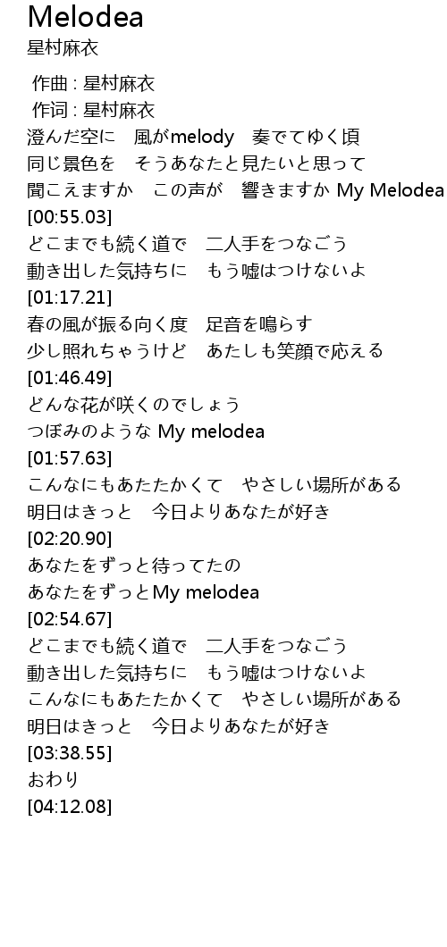 | [00:43.03] | 聞こえますか この声が 響きますか My Melodea |