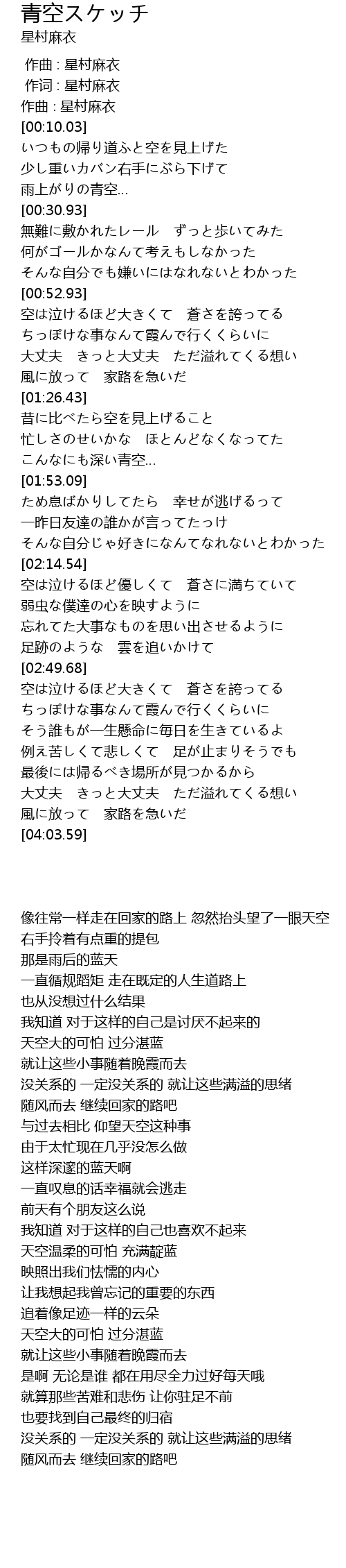 | [00:53.51] | 空は泣けるほど大きくて 蒼さを誇ってる |