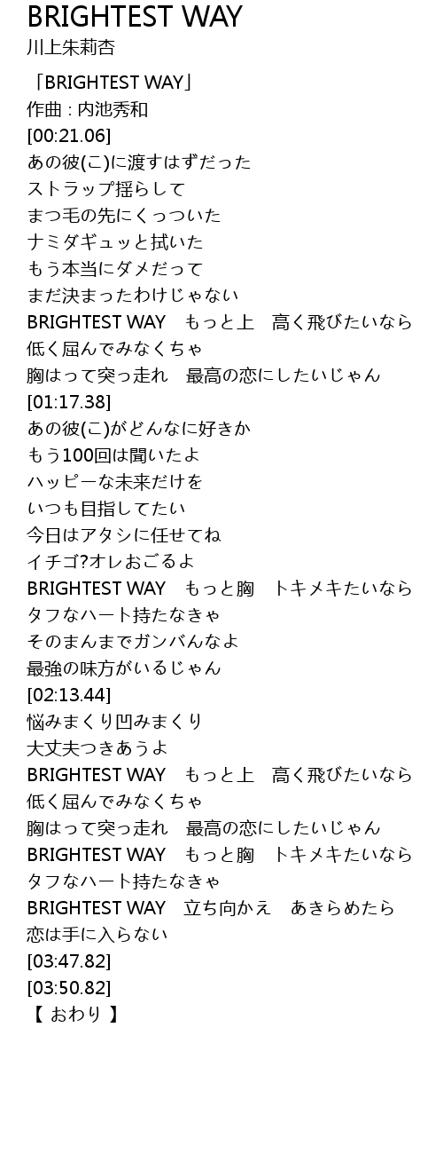 | [03:25.73] | BRIGHTEST WAY もっと胸 トキメキたいなら |
