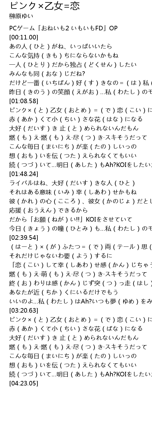 | [03:43.06] | ピンク×(と)乙女(おとめ)=(で)恋(こい)になる |