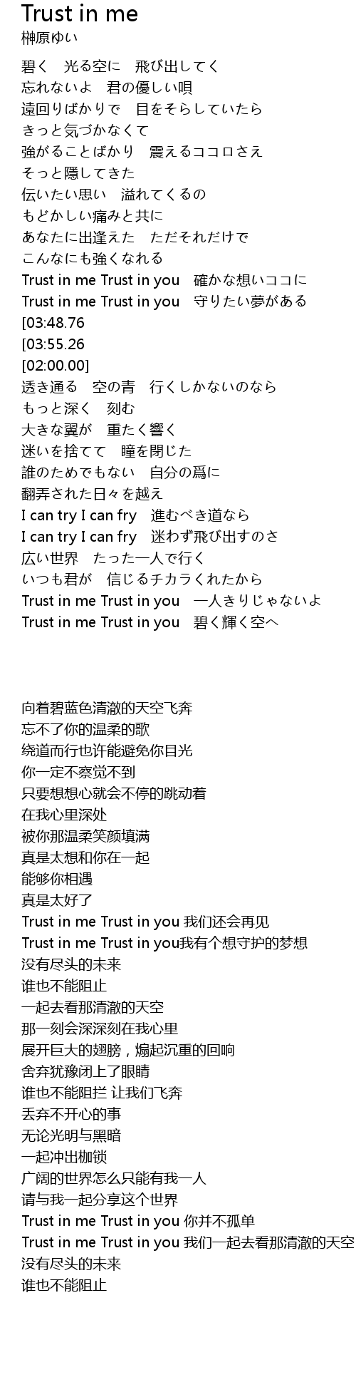 | [03:35.52] | Trust in me Trust in you 一人きりじゃないよ |