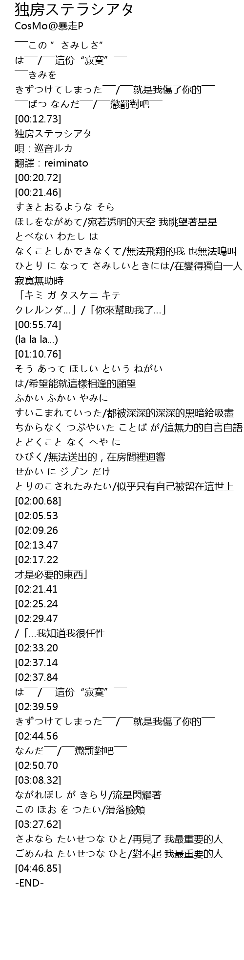 | [04:13.50][02:37.84] | ―――この ”さみしさ” は―――/―――這份“寂寞”――― |
