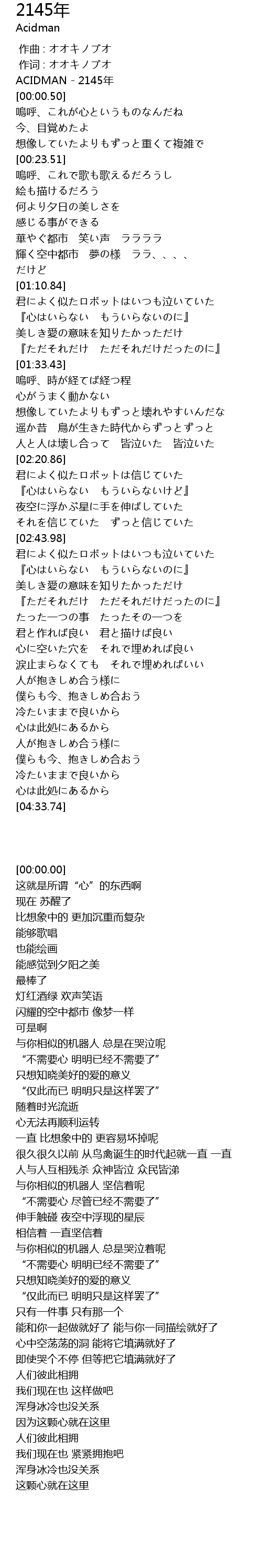 | [01:11.65] | 君によく似たロボットはいつも泣いていた |