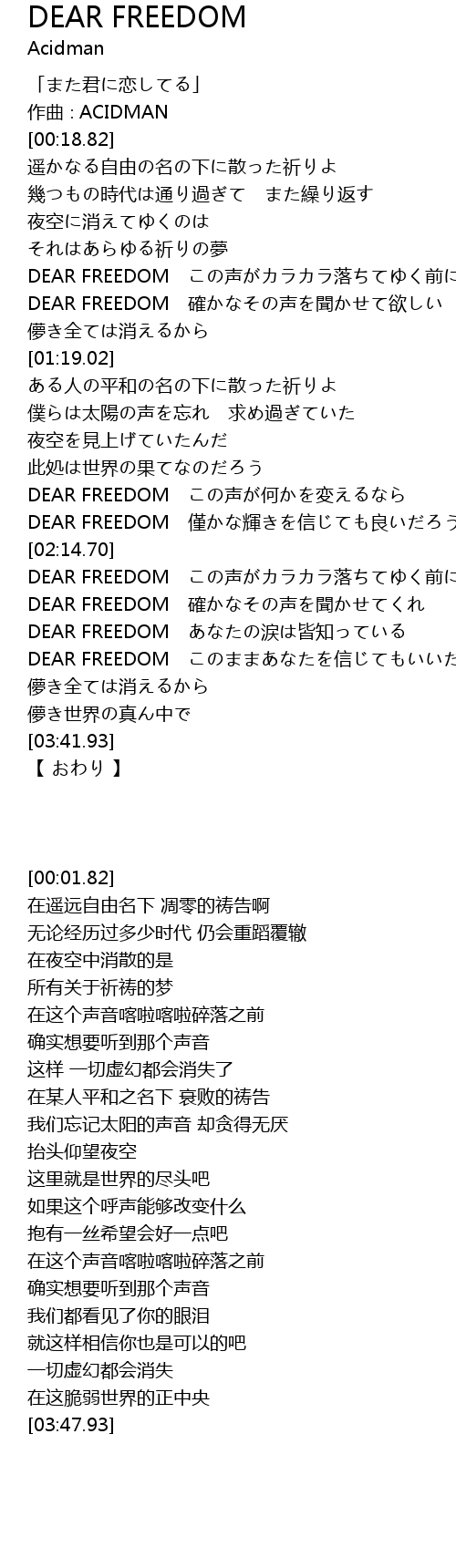 | [00:54.12] | DEAR FREEDOM この声がカラカラ落ちてゆく前に |