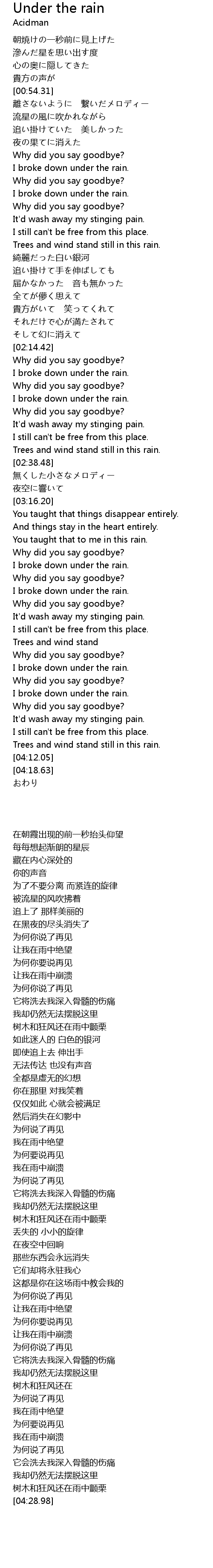 | [04:03.07] | Trees and wind stand still in this rain. |