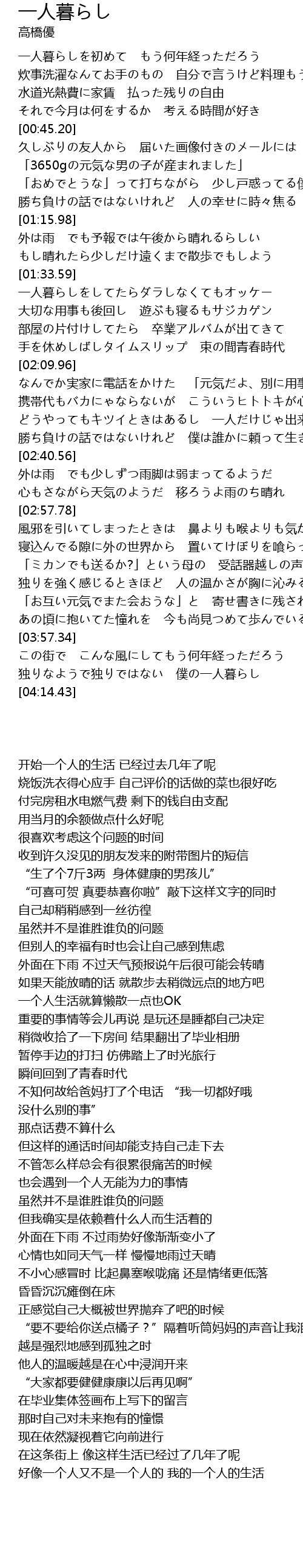 | [04:05.49] | 独りなようで独りではない 僕の一人暮らし |