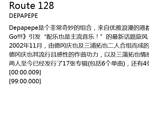 | [02:15.18] | 德冈庆也其流行且感性的作曲功力,以及三蒲拓也情感纤细且大胆的吉它弹奏,DEPAPEPE的组合成为日本乐坛一股跨界的新兴势力!用手指及琴弦歌唱的DEPAPEPE,将用他们音乐里不同趣味风貌的曲调,邀请你一起进入这变幻多彩的吉它的世界! |