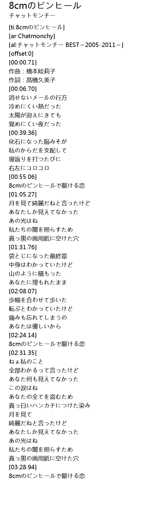 | [03:42.44] | 8cmのピンヒールで駆ける恋 |