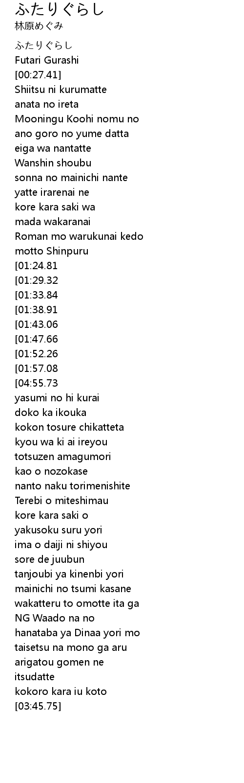 | [00:21.12] | Futari Gurashi |