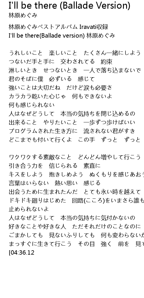 | [00:01.26] | I'll be there(Ballade version) 林原めぐみ |