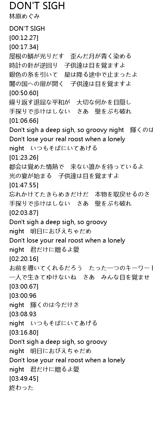 | [03:17.46] | Don't sigh a deep sigh, so groovy night 明日におびえちゃだめ |