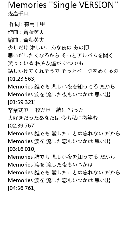 | [02:58.014] | Memories 涙を 流した恋もいつかは 思い出 |