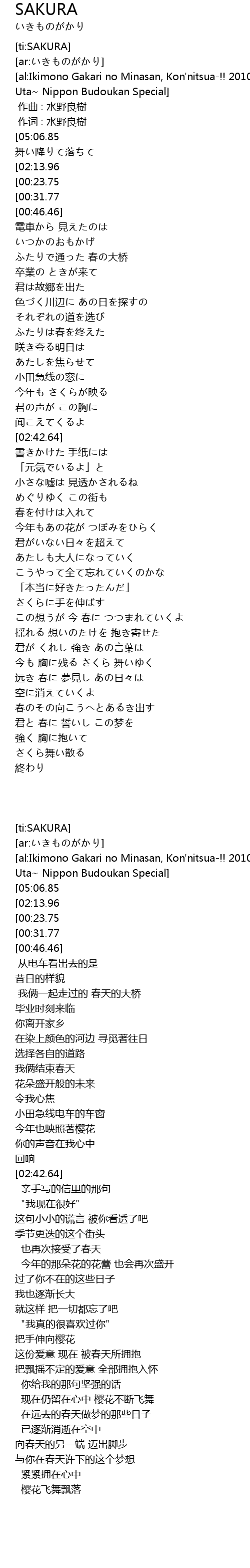 | [02:27.60][00:31.77] | 今も見えているよ さくら 舞い散る |