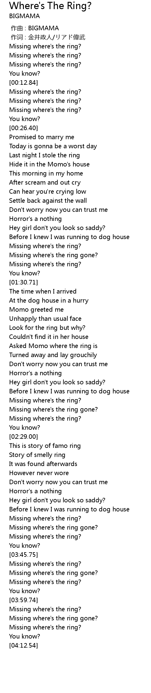| [03:33.83] | Missing where's the ring? |