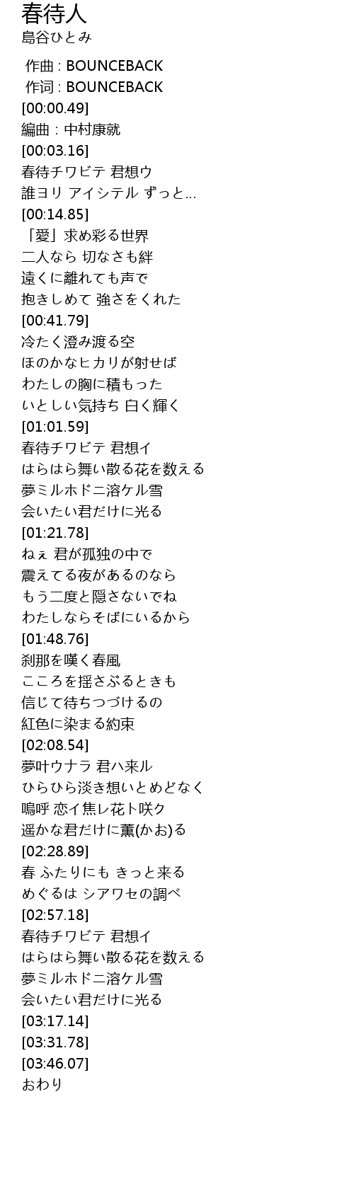 | [00:04.16] | 春待チワビテ 君想ウ |