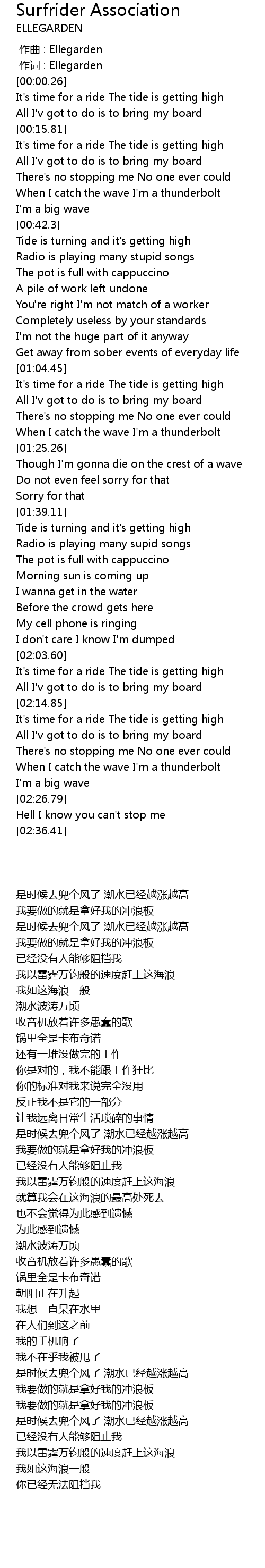 | [00:17.40] | It' s time for a ride The tide is getting high |