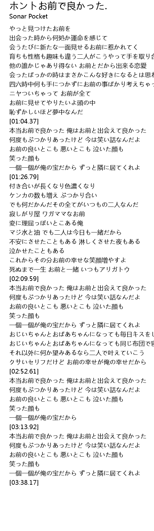 | [01:04.63] | 本当お前で良かった 俺はお前と出会えて良かった |