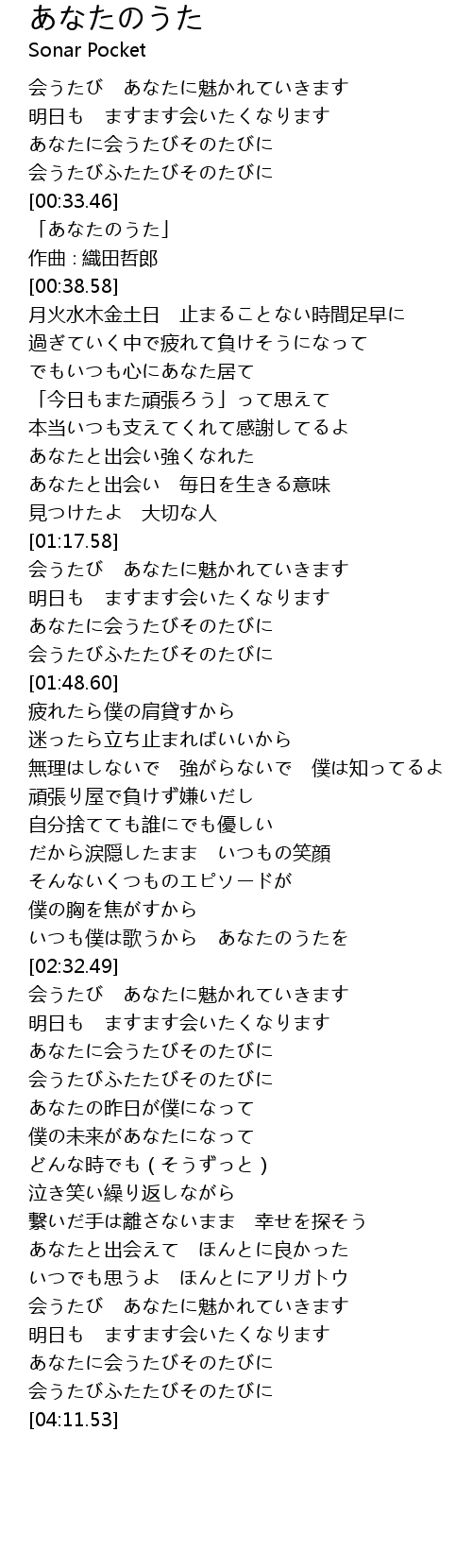 | [02:22.83] | いつも僕は歌うから あなたのうたを |