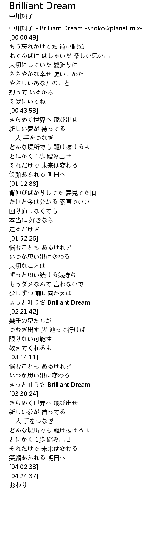 | [00:00.00] | 中川翔子 - Brilliant Dream -shoko☆planet mix- |