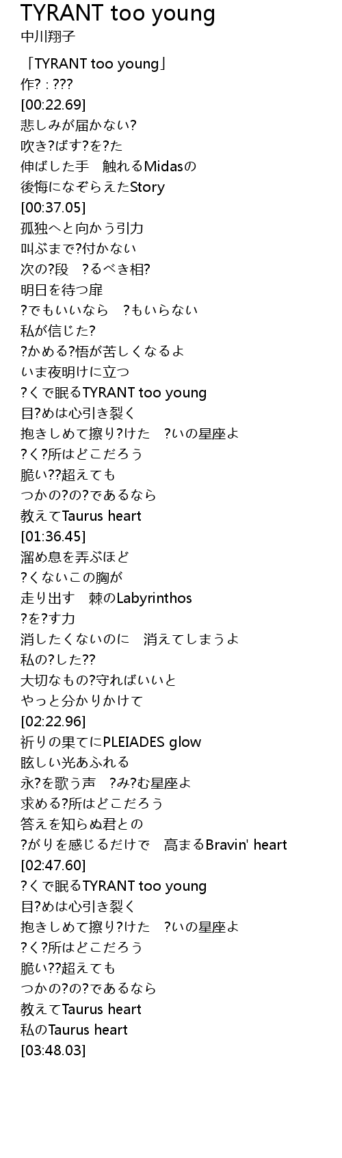 | [03:22.93] | ?くで眠るTYRANT too young |