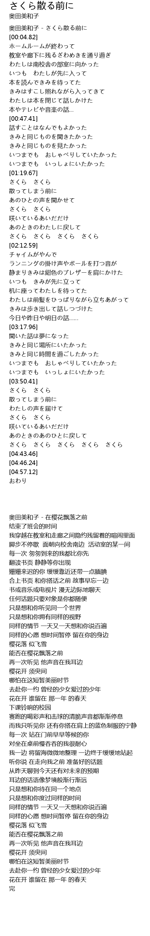 | [00:00.00] | 奥田美和子 - さくら散る前に |