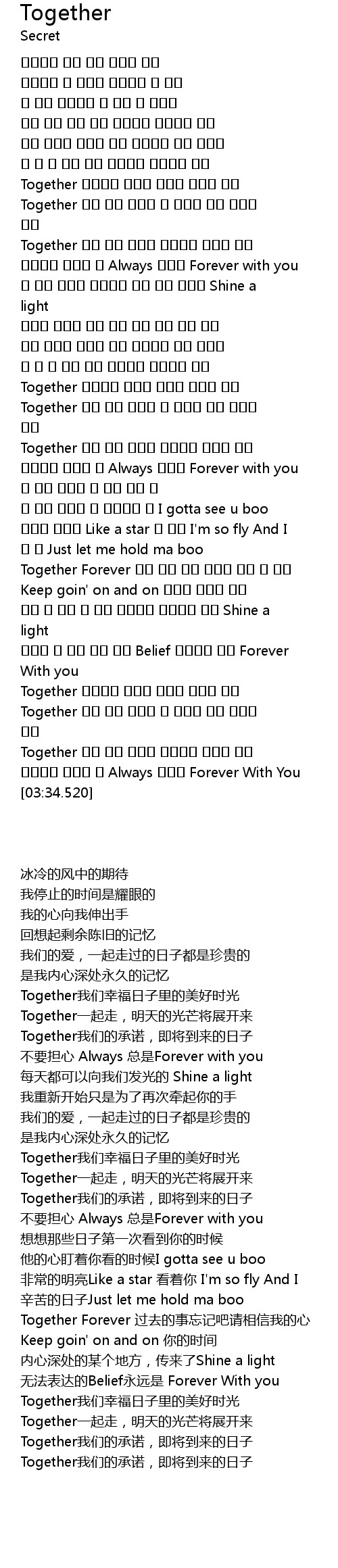 | [03:14.380] | Together 함께 걷는 내일엔 더 새로운 빛이 펼쳐질 거야 |