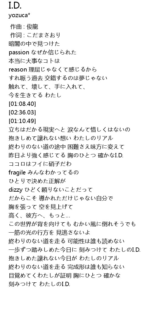 | [02:58.17] | 一歩ずつ踏みしめた今日に 刻みつけて わたしのI.D. |