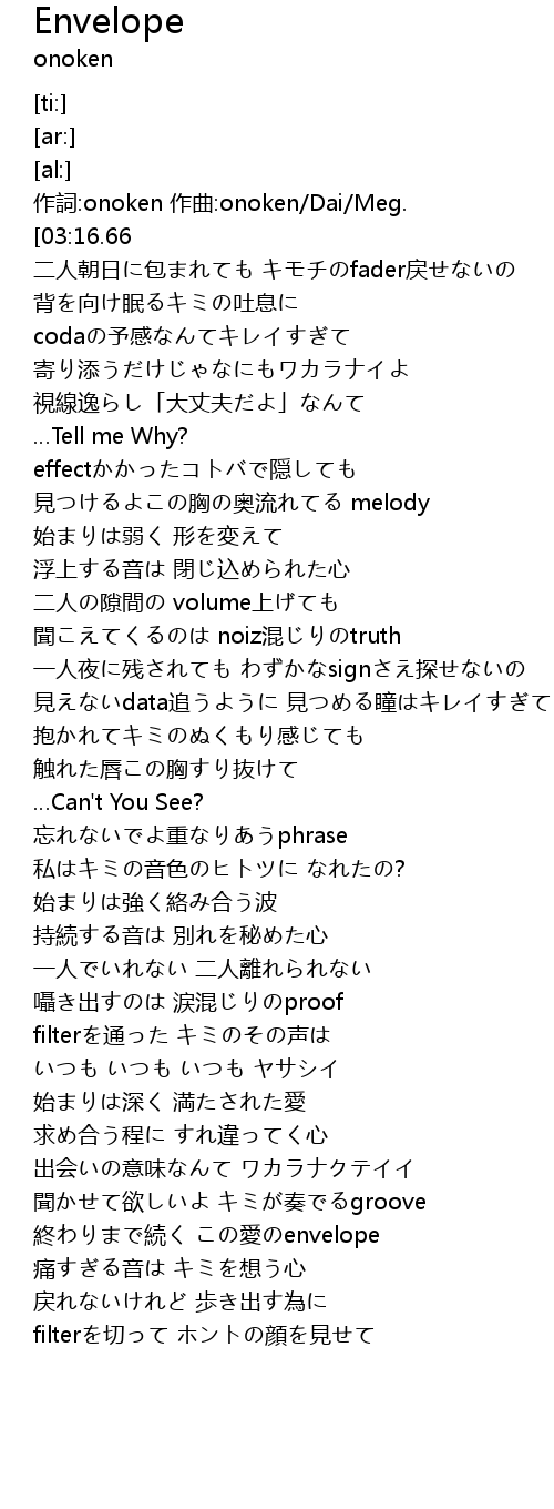 | [00:11.79] | 作詞:onoken 作曲:onoken/Dai/Meg. |