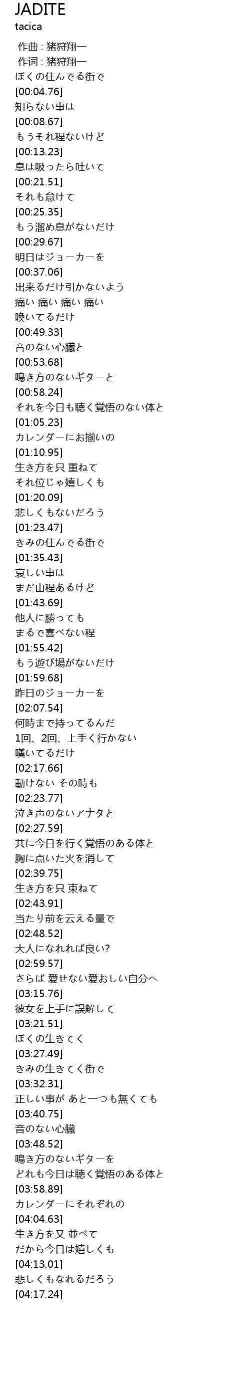 | [00:59.09] | それを今日も聴く覚悟のない体と |